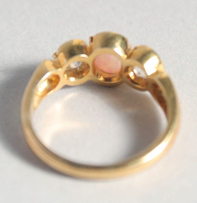 A SILVER 18ct. GOLD PLATED OPAL AND CUBIC ZIRCONIA RING.