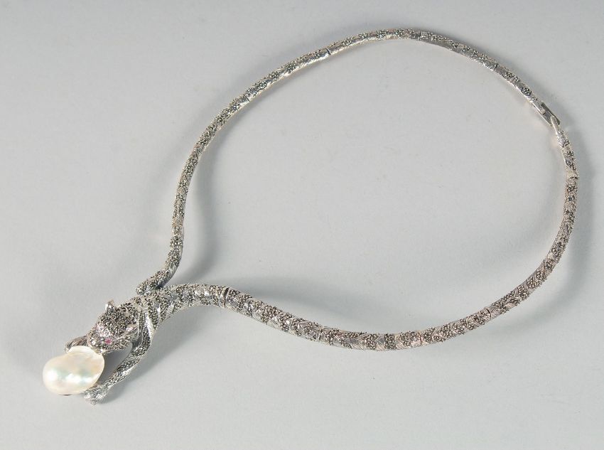 A SILVER BAROQUE PEARL PANTHER NECKLACE.