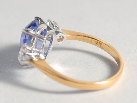 A SILVER GOLD PLATED, PEAR SHAPED, FAUX TANZANITE AND CUBIC ZIRCONIA RING.