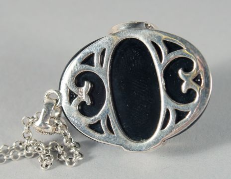 A SILVER ONYX AND MARCASITE PANTHER PENDANT AND EARRINGS.