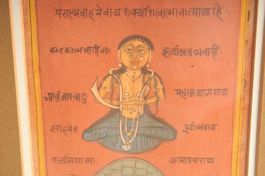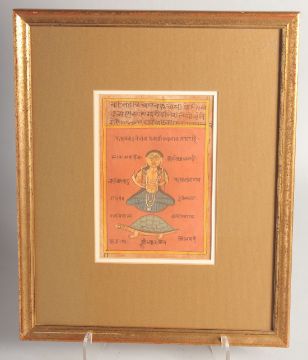 A 19TH CENTURY INDIAN ODISHA PAINTING OF A TANTRIC DEVI, with Devanagari inscriptions, framed and glazed, image 19.5cm x 13cm.