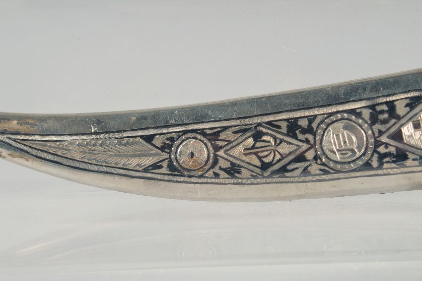 A FINE EARLY 20TH CENTURY IRAQI NIELLO AND GOLD INLAID SILVER DAGGER, 35cm long.
