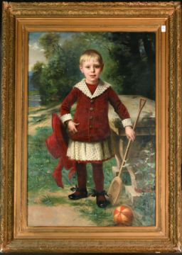 Edmond Louis Dupain (1847-1933) French, a child in a red outfit in a lakeside setting, oil on canvas, signed and dated 1888, 39.5" x 27.75", (101 x 71cm).