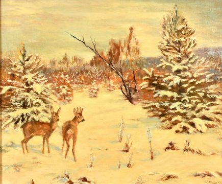 Wilhelm (Willi) Lorenz (1901-1981) German, A winter landscape with two deer standing in snow surrounded by trees, oil on canvas laid down, signed, 19.25" x 23", (49 x 58.5cm).