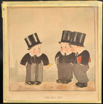 Chloe Preston, 'The new boy', schoolboys with the silhouette of a school behind, possibly Eton, watercolour, signed, 13" x 12.75", (33x32.5cm) (unframed).