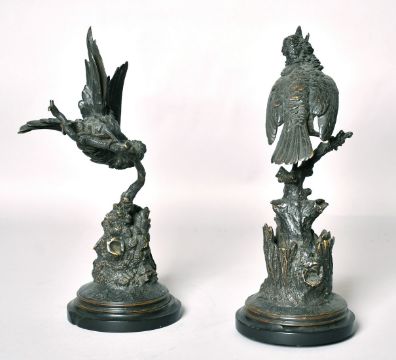 Ferdinand Pautrot (19th Century) French, A pair of bronzes, birds on a branch, mounted on circular marble bases, signed, 11.5", (29cm) including base (2).