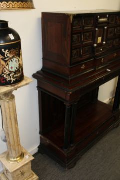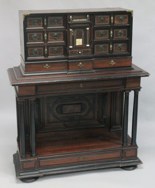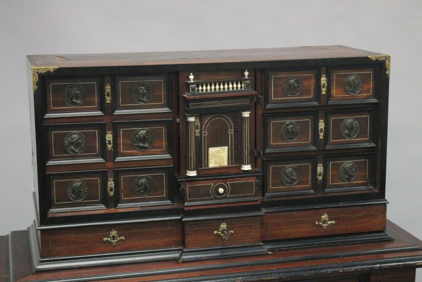 A VERY GOOD 19TH CENTURY CONTINENTAL ROSEWOOD, EBONY AND IVORY INLAID VARGUENO, the upper section with central architectural style door, enclosing four small drawers, flanked by six drawers., each with a pair of cast bronze portrait roundel, above three further drawers, the open base with four turned columns and tow further long drawers.