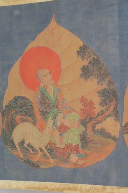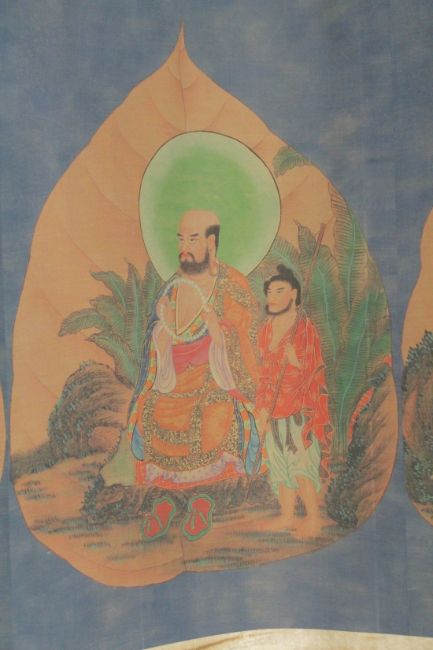 A VERY LARGE GOOD QUALITY CHINESE SCROLL PAINTING ON SILK, depicting a variety of leaf-form panels of sages, the painting itself approx. 195 ins wide x 35 ins high.
