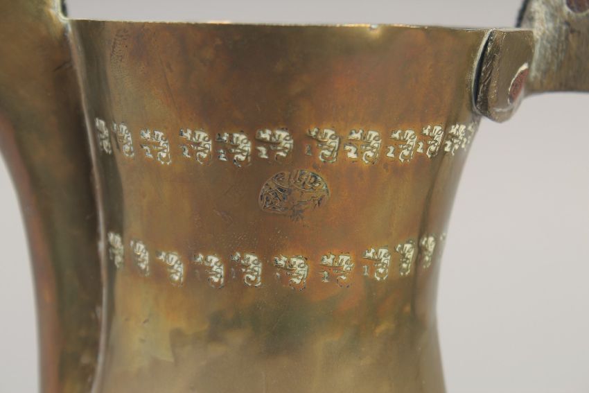 AN ISLAMIC SIGNED BRASS COFFEE POT, 29.5cm high.