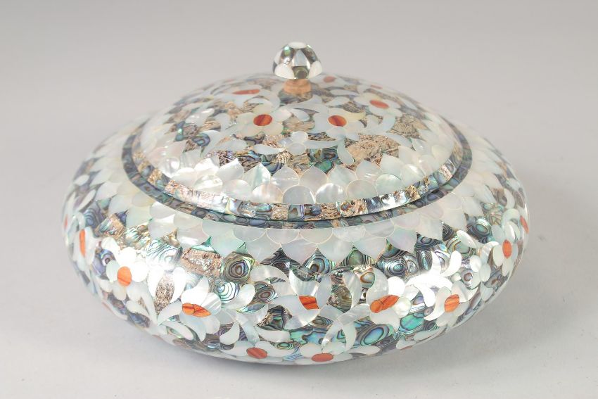 THREE MOTHER OF PEARL AND ABALONE OVERLAID WOODEN LIDDED CIRCULAR BOXES, graduating sizes, largest 23cm diameter, (3).