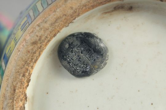 A LARGE PAIR OF CHINESE FAMILLE ROSE PORCELAIN VASES, each decorated with Shou symbols, peach and bats, each base with a wax export seal, 16.7in high.