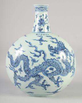 A LARGE CHINESE BLUE AND WHITE PORCELAIN MOON FLASK DRAGON VASE, bearing six-character mark, 44cm high.