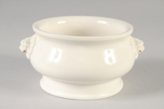A BLANC DE CHINE TWIN HANDLE CENSER, with molded lion dog handles, bearing character mark to base, 15cm (handle to handle).
