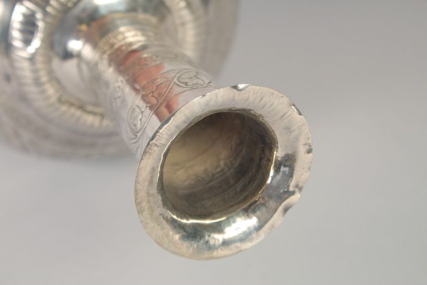A FINELY ENGRAVED INDIAN OR SOUTH EAST ASIAN WHITE METAL SURAHI BOTTLE, 23cm high.