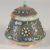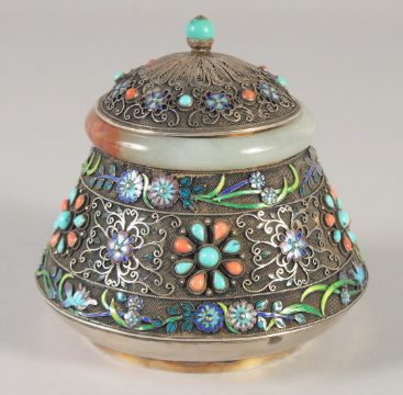A SUPERB SILVER FILIGREE CORAL AND TURQUOISE STUDDED BOX AND COVER, with jade banded rim and decorative enamelled flowers, stamped to base, 11cm high.