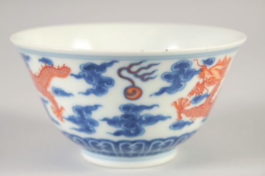A CHINESE BLUE, WHITE AND IRON RED BOWL, with dragons and stylised clouds, Xuantong mark to base, 11cm diameter.