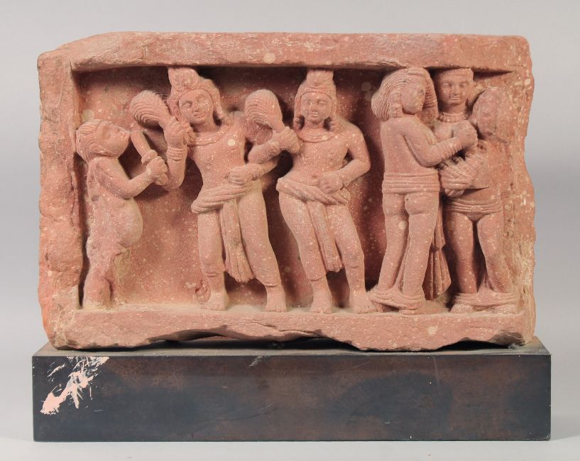 AN INDIAN MATHURA KUSHAN RED STONE CARVED PANEL, depicting kings and aprsa, with mounted base, panel 28cm x 44cm.