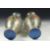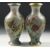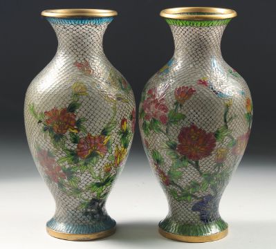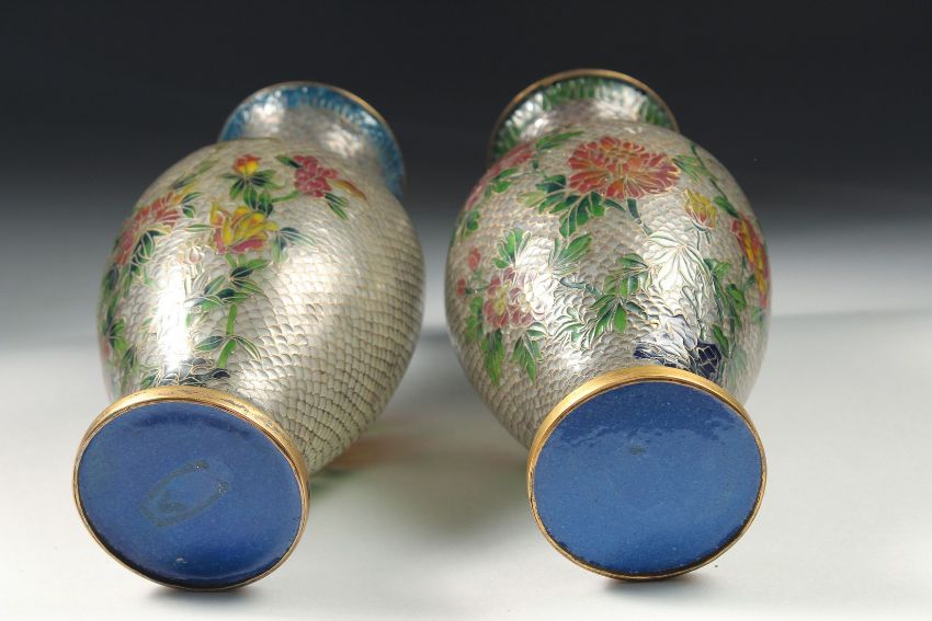 A PAIR OF CHINESE GLASS CLOISONNE VASES, decorated with colourful glass and wirework flowers with bird and butterfly on a scale pattern ground, the bases with blue enamel, 20.5cm high.