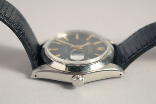 A GENTLEMAN'S ROLEX OYSTER DATE WRISTWATCH with black dial and leather strap.