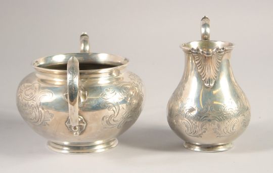 A VICTORIAN ENGRAVED SILVER TWO HANDLED CIRCULAR SUGAR BOWL AND MILK JUG.