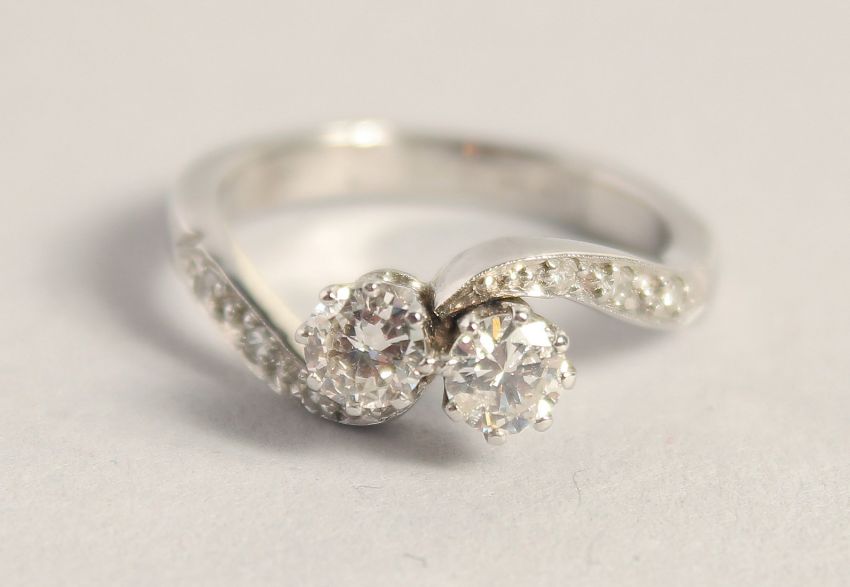 A PLATINUM TWO STONE DIAMOND CROSSOVER RING.