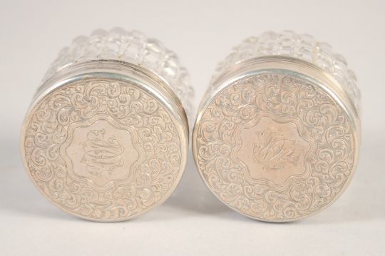 A SMALL PAIR OF VICTORIAN SILVER TOP CIRCULAR BOTTLES.