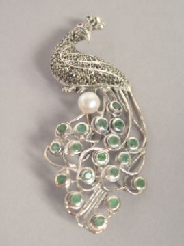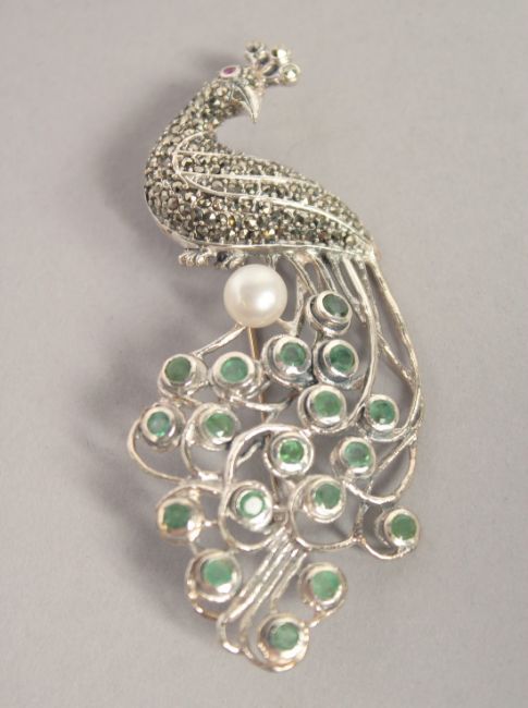 A SILVER EMERALD MARCASITE AND PEARL PEACOCK BROOCH.