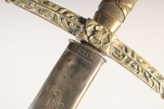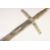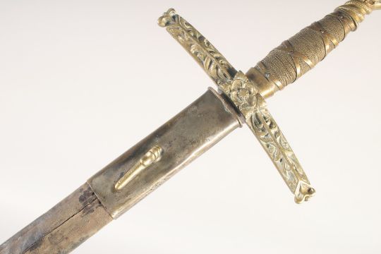 A REPLICA OF A KNIGHTLY SWORD, early 20th century, slender fullered straight pointed 29in blade, cast brass hilt, downturned quillons, in its white metal & leather scabbard.