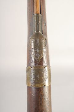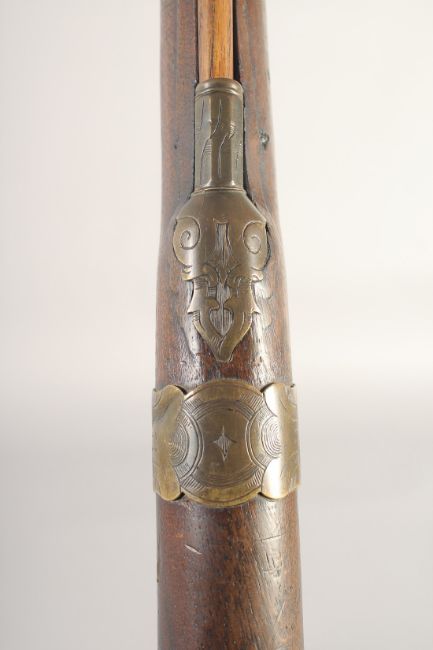 A FINE GERMAN FLINTLOCK SPORTING GUN, circa 1740, Spanish form 18 bore 44in barrel signed at the breech Andre Zwige Nwoly, finely engraved lock signed Andre Zwigler and with hunter & game, walnut half stocked with chiselled decoration & engraved brass mounts.