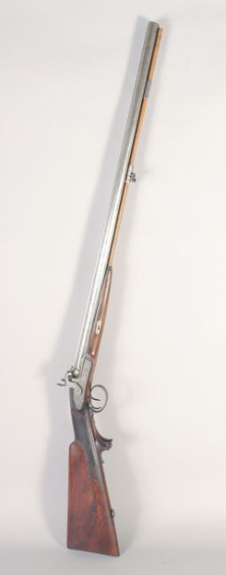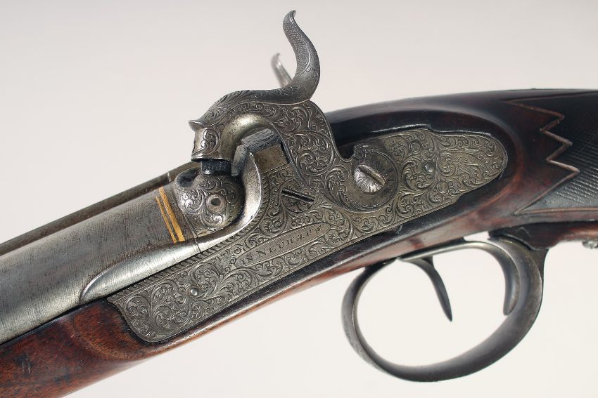 A HIGH QUALITY GERMAN DOUBLE-BARRELLED PERCUSSION SPORTING GUN, circa 1850, 16 bore 29in Damascus barrels with a raised rib, signed in gold 'A Kramer in Neuhaus' two gold lines at breech, both breech & tang deeply scroll engraved and gold lined, flat deeply engraved locks with flat engraved dolphin hammers, highly figured walnut stock, wood and chiselled steel trigger guard, horn tipped wooden ramrod.