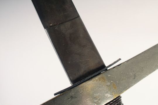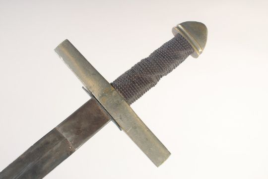 A REPLICA OF KNIGHTLY SWORD, early 20th century, long double edged tapered 35.5 in blade stamped 'Aug Schneider Hoflieferant Berlin', hilt with twisted wire grip, straight quillons, domed pommel, in its black leather scabbard with white metal mounts.