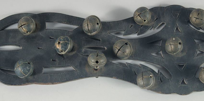 A HORSES LEATHER GIRTH STRAP, with fifteen brass bells, 40cm long.