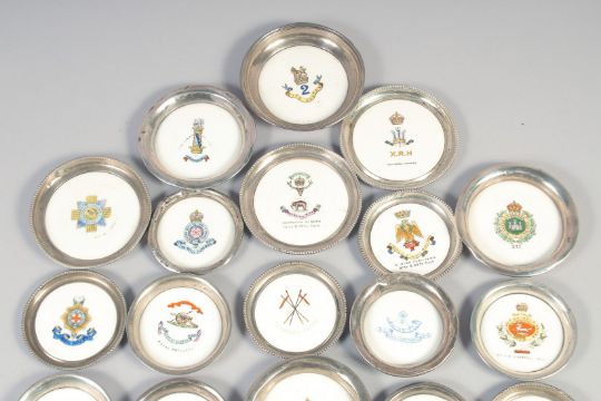 A COLLECTION OF TWENTY ONE AYNSLEY PORCELAIN AND SILVER STANDS, with military coat of arms in a leather case, (21).