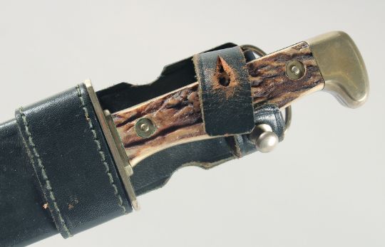 WAIDBLATT ORIGINAL EICKHORN SOLINGEN KNIFE, with antler handle, 13" long, in a leather sheath.