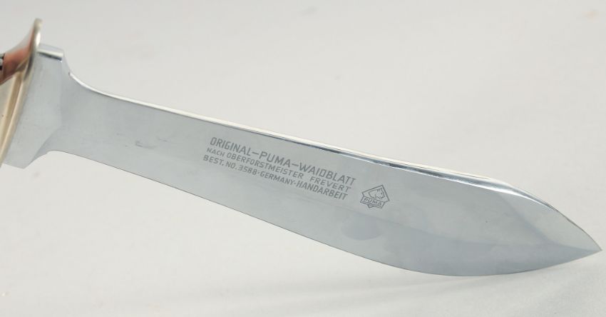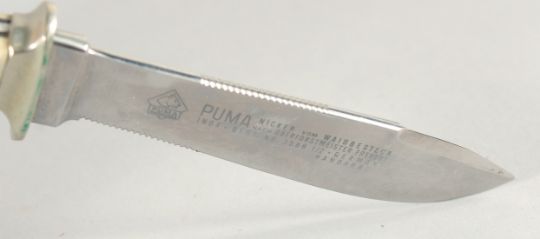 ORIGINAL-PUMA-WAIDBLATT KNIFE AND PUMA NIKER VOM WAIDBESTECK KNIFE, both with antler handles 12" long and 7.5" long in a leather scabbard.