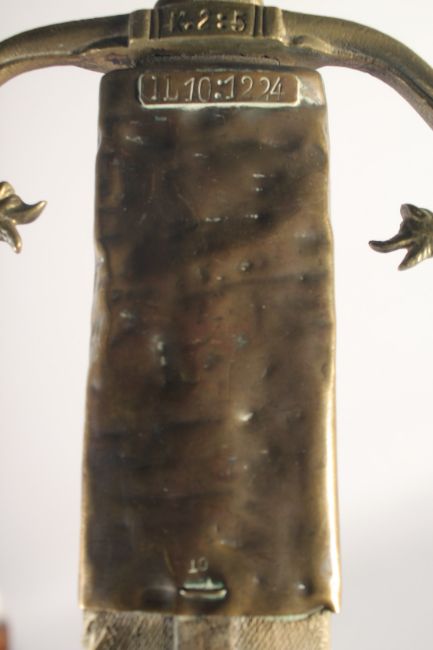 A THEATRICAL REPLICA OF A VENETIAN KNIGHTLY SWORD, early 20th century, straight edged pointed 34in blade, brass hilt with downturned quillons & cat's head pommel with masks, in its grey velvet & embossed brass scabbard.