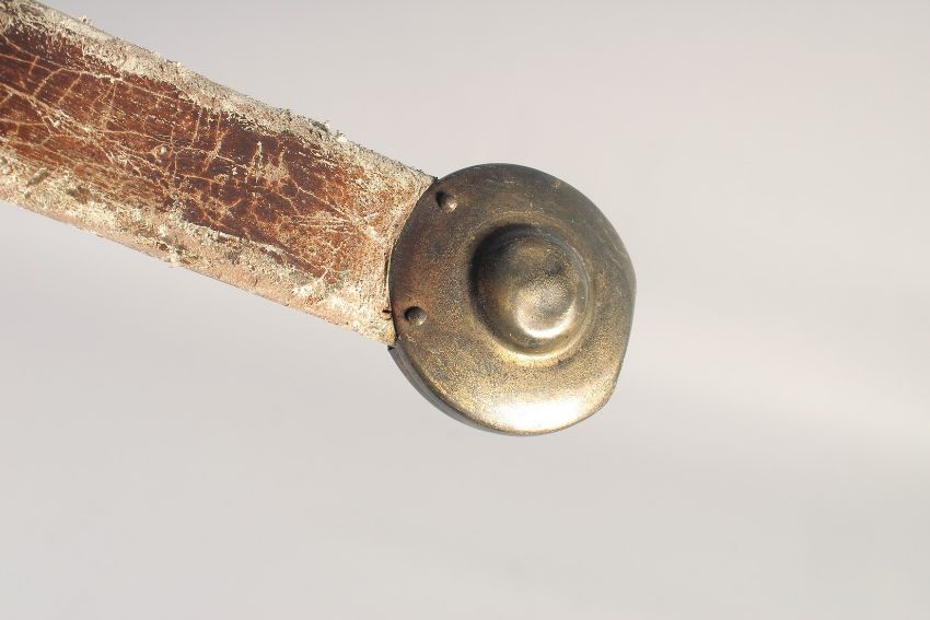 A REPLICA OF A VIKING BROAD SWORD, early 20th century, wide tapering blunt 37 in blade white horn grip with white metal mounts, in its red leather scabbard with brass mounts & wheel chape.