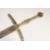A THEATRICAL REPLICA OF A KNIGHTLY SWORD, early 20th century, straight pointed 33.5 in blade, cast brass hilt, downturned quillons, in its embossed brass and black leather scabbard.