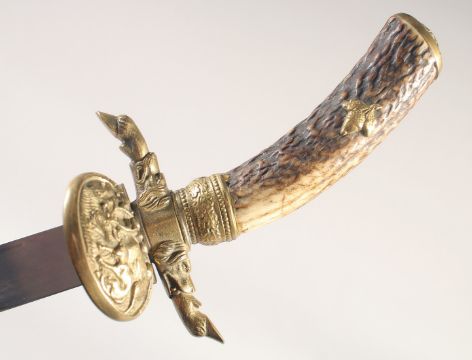 A HUNTING TROUSSEAU, mid-20th century, comprising sword with straight fullered 16in blade, brass shell guard & knucklebow with stag horn scales & a short dirk with double edged 9.5 in blade, shell guard & hoof quillons, stag horn grip, in their leather scabbard.