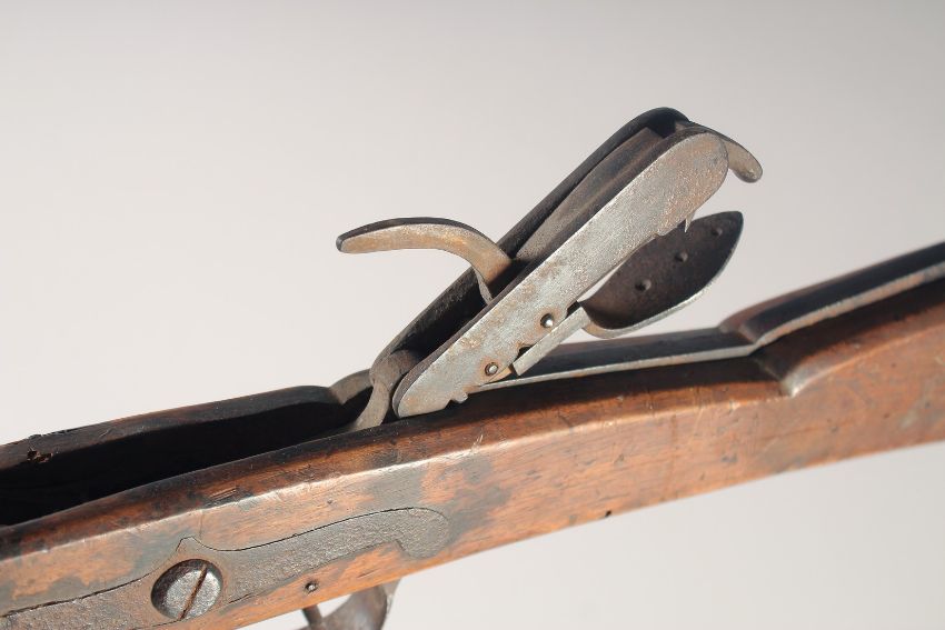 AN ENGLISH STONE BOW, circa 1770, beech stocked with iron mounts, iron bow, folding fore sight, folding goat's foot lever, folding rear sight, probably made in Yorkshire, 29in overall.