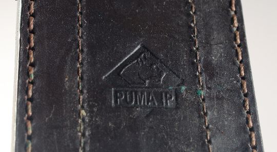 A GRIZZLY STAG 89008 PUMA KNIFE, with antler handle, 13" long in a leather scabbard.