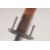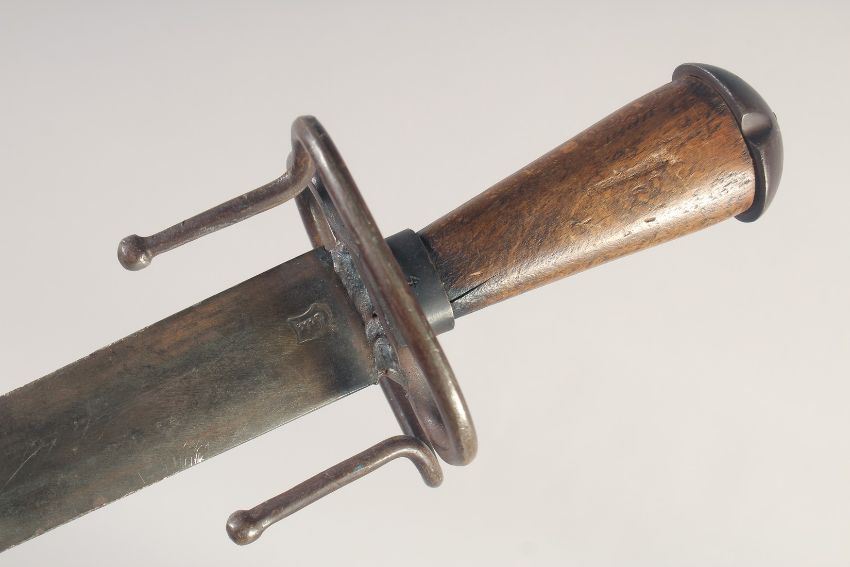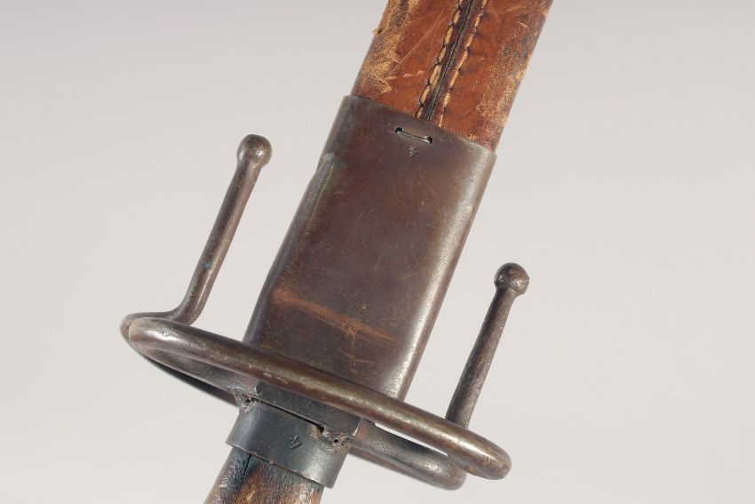 A REPLICA OF A SHORT SWORD, early 20th century, double edged tapering pointed 17.5 in blade, hilt with downwards twisting quillons, domed pommel & wooden grip, in its leather scabbard with iron mounts, chape missing.