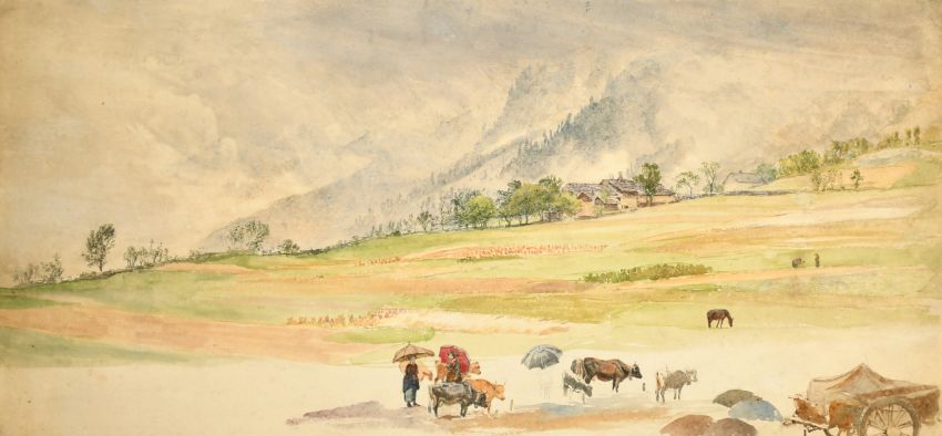 James Duffield Harding (1793-1863) 'Near Lucerne, Switzerland', figures holding parasols with cattle and cart a mountain landscape, watercolour and pencil, titled under mount and dated 1860, label verso, 9.5" x 19.75", (24x50cm) (unframed).