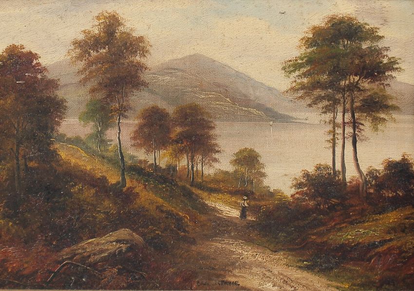 G. Willis Pryce (1866-1949) British, A landscape view of a figure on a path leading down to a lake with a boat on the water and mountains beyond, oil on canvas, signed, 8" x 12", (20x30cm).