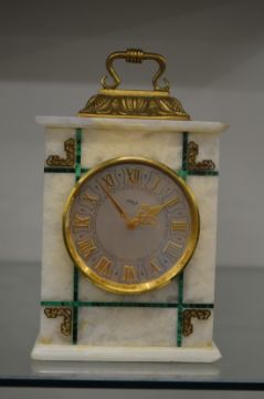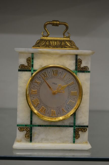 A good Swiss alabaster and malachite small mantel clock.