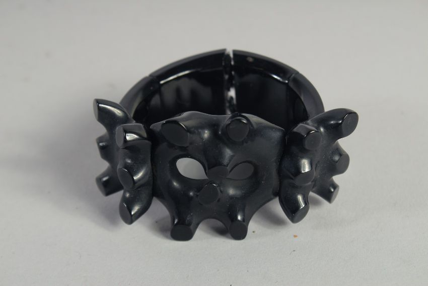 A WHITBY JET BRACELET AND TWO CARVED BROOCHES (3). 79gms.