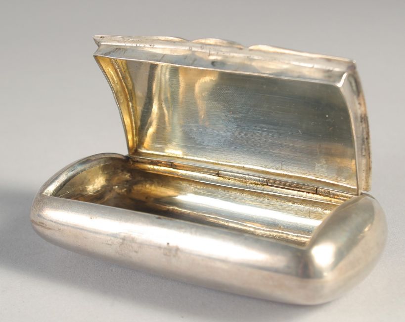 A SILVER NEILLO SNUFF BOX, boats and buildings, 3ins long and a 19th CENTURY SWEDISH SNUFF BOX, 3.25ins long. (2).
