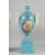 A LARGE PAIR OF CONTINENTAL LIGHT BLUE TWO HANDLED URNS AND COVERS with classical female heads, on stands.