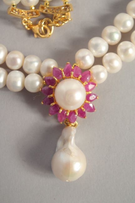 A PEARL NECKLACE with gold plated ruby and Baroque pearl clasp.