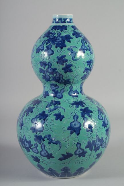 A CHINESE TURQUOISE GROUND BLUE AND WHITE DOUBLE GOURD VASE, decorated with gourds and bats, six-character mark to base, 35cm high.